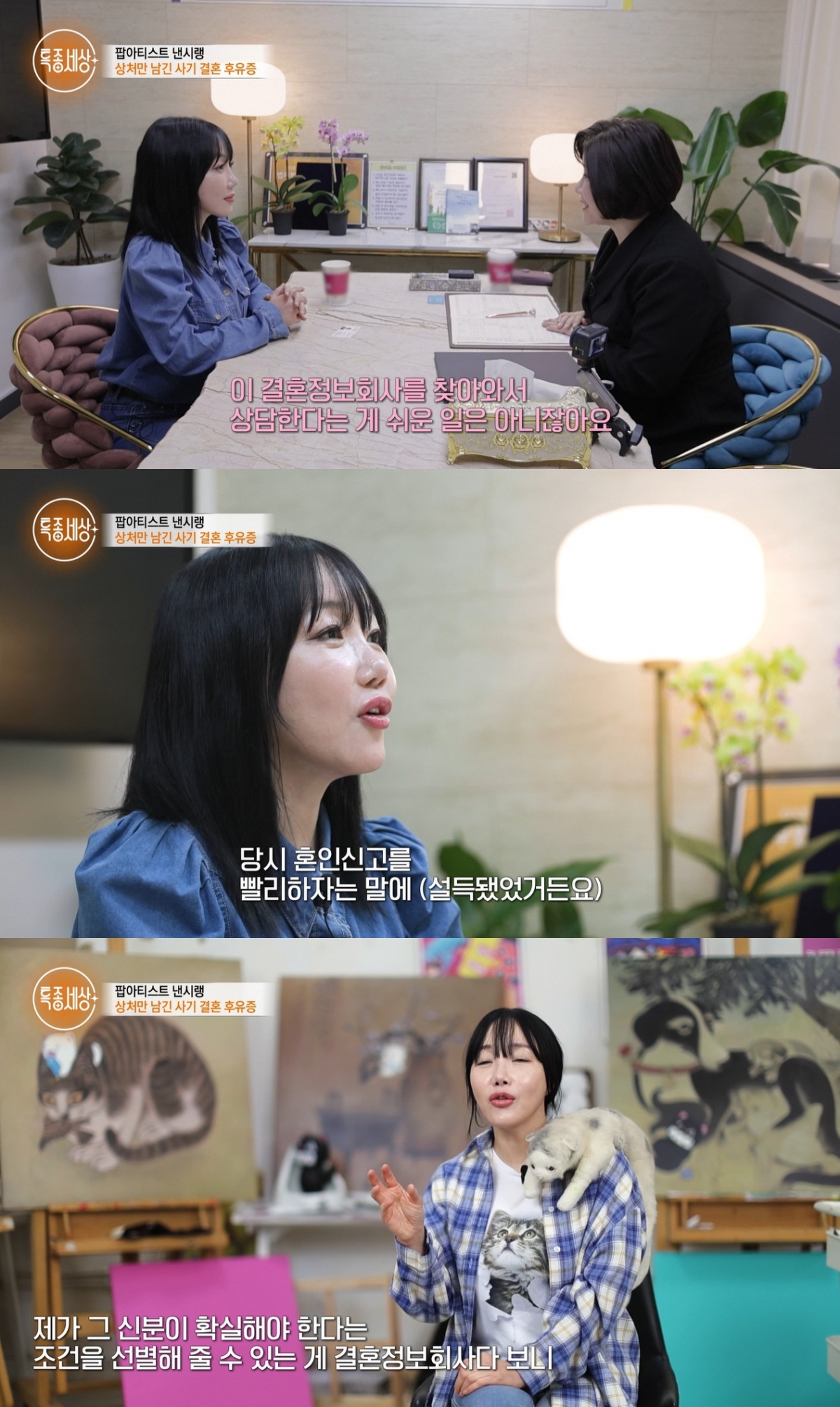 낸시랭은 결혼정보회사를 찾았다. 회사 대표는 "결혼정보회사를 찾아와 상담한다는 게 쉬운 일은 아니지 않나. 결혼 경험도 있고, 일반인도 아니다. 두려움이 있는데 용기 내서 온 건 잘했다"라고 격려했다.