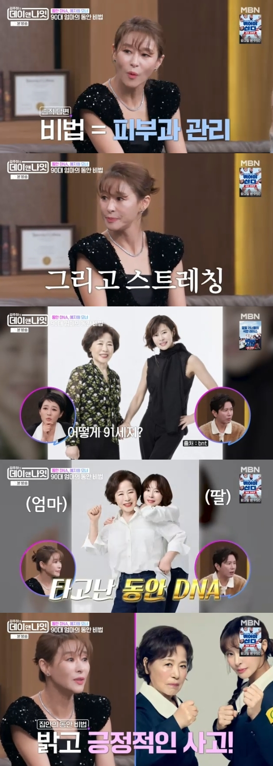이때 김주하는 "어머니도 유명한 동안이시다"라며 91세에 동안 미모를 자랑하는 예지원의 모친을 언급했다.