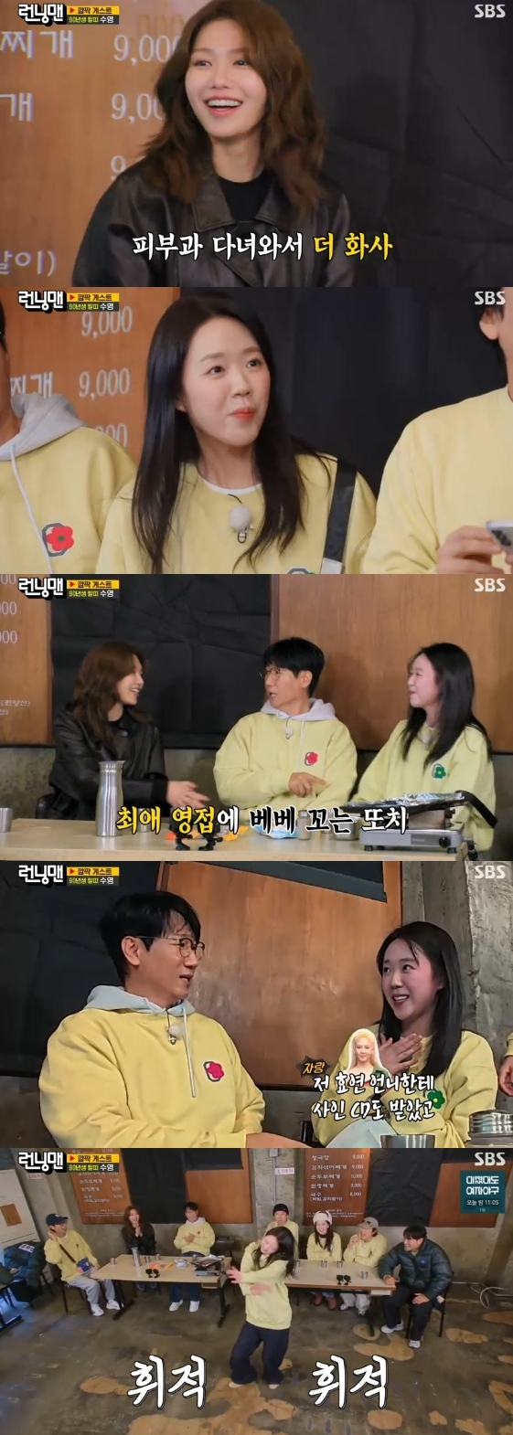 얼마 후 강남의 한 삼겹살집에 수영이 등장하자 멤버들은 박수를 치며 격하게 환영했다. 하하는 "수영이 유럽 배우 같아"라고 치켜세우는가 하면 유재석은 "런닝맨 초창기에 나왔던 소시의 수영과 느낌이 다르다"라고 맞장구쳤다.