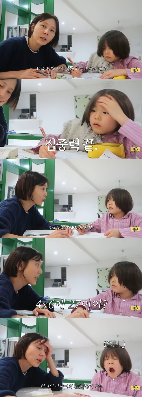 김나영은 또 구구단을 잘 외우지 못하고 연신 하품하는 아들을 보며 한숨을 내쉬었다. 그는 "이거 빨리 풀어내!"라고 명령했으나 신우 군은 "괜찮아. 내 일 아니잖아"라고 해맑게 웃어 웃음을 자아냈다.