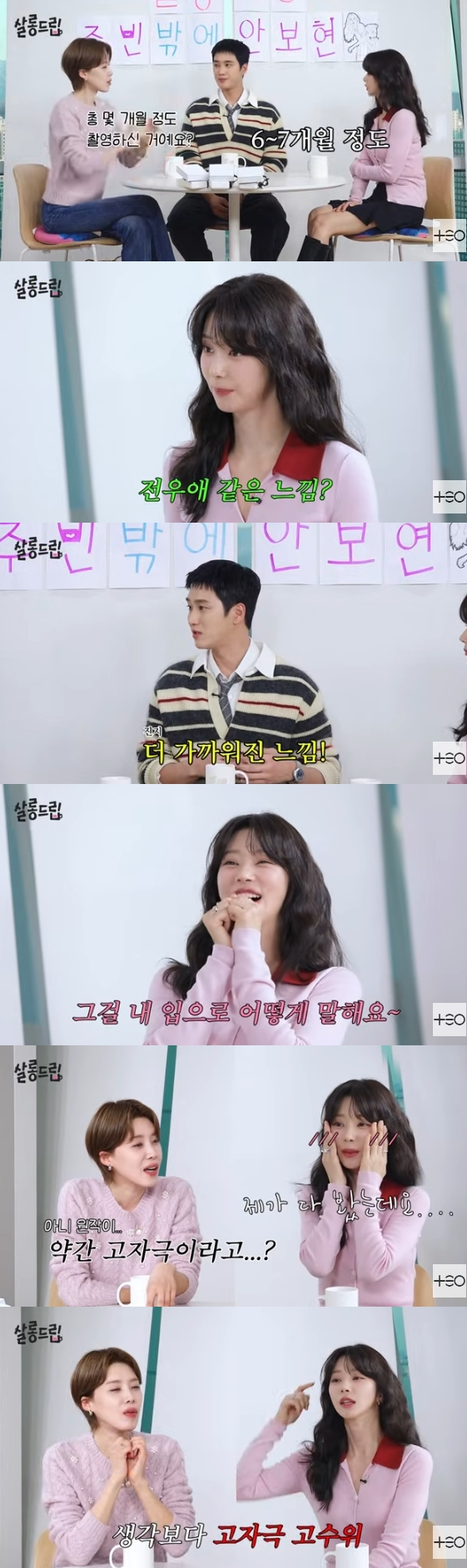 안보현은 또 "장르 자체가 로맨틱 코미디이다 보니까 스킨십이 많다. 스킨십하고 나서 더 가까워졌다"라고 말해 현장을 술렁이게 했다. 이주빈은 "맞다. 나도 그 얘기를 하려고 했는데 민망해서 말을 못 했다"며 쑥스러운듯 웃음을 터뜨렸다.