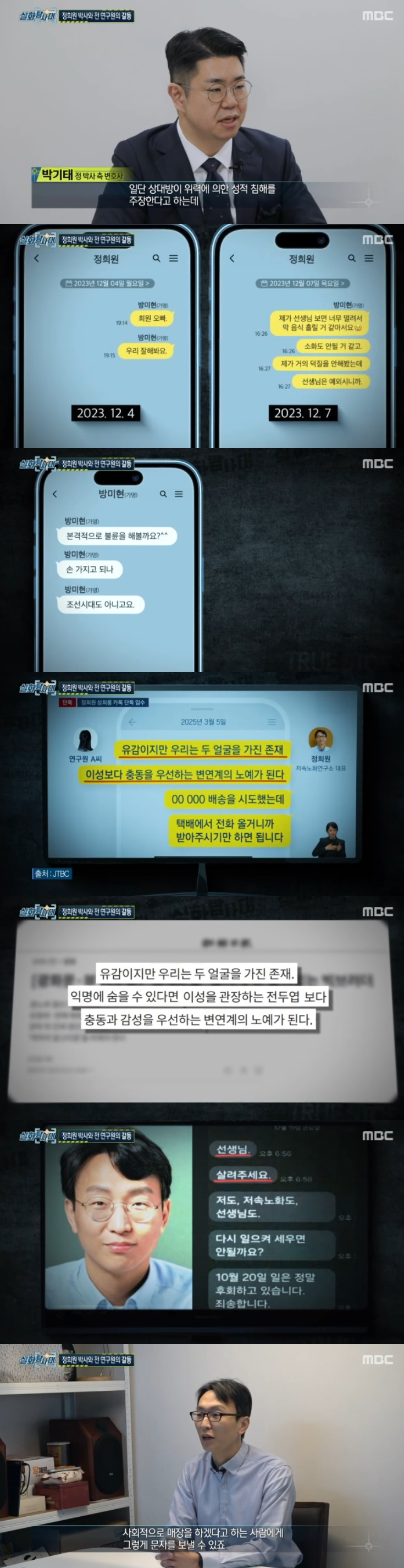 8일 방송된 MBC '실화탐사대'에서는 A씨와 성 착취 및 갑질 여부를 두고 진실 공방을 벌이고 있는 정희원과 단독 인터뷰를 진행했다.