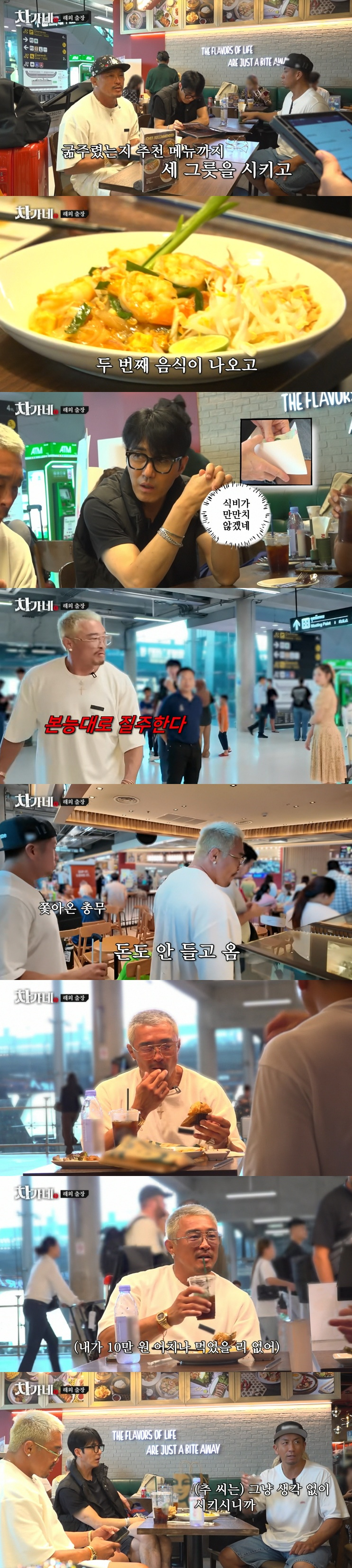 이에 추성훈이 "이게 10만 원이라고? 절대 그럴 리가 없다"며 황당해하자 차승원은 "공항이니까 그럴 수 있지"라고 했다. 토미는 "생각 없이 시키시니까"라고 추성훈을 놀렸다.