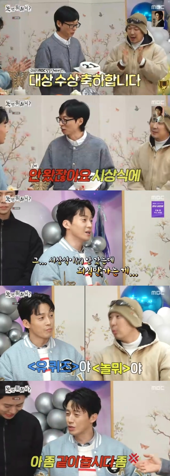 10일 방송된 MBC 예능 프로그램 '놀면 뭐하니?'에는 새해 첫날 '2025 MBC 방송연예대상'에서 21번째 대상을 수상한 유재석을 축하하는 하하, 주우재, 허경환의 모습이 그려졌다.