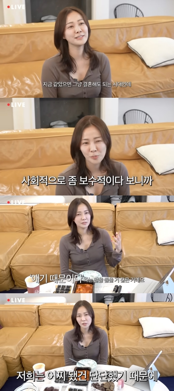 그는 "결혼 발표해서 남편이 기자회견을 했다. 지금 같았으면 그냥 결혼해도 되는 시대인데 그 당시만 해도 사회적으로 보수적이다 보니까 저희 나름대로 고민이 많았다"라고 떠올렸다.