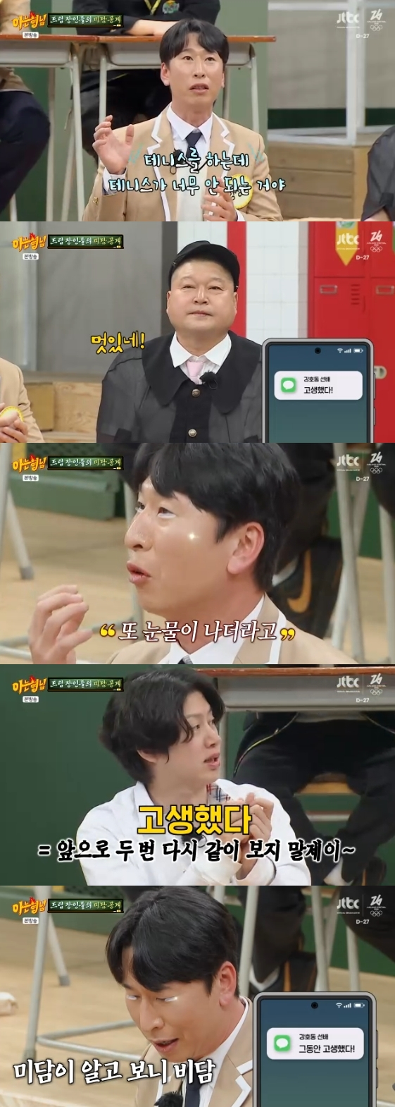 양상국은 "제가 테니스를 하는데 너무 안되더라. 너무 힘들어서 실제로 촬영 중간에 나 자신에게 열받아서 울었다. 호동이에게 연락처를 알려준 적이 없는데 '고생했다'라고 문자를 보내줬다. 진짜 감동받아서 눈물이 나더라"라고 전해 분위기를 훈훈하게 만들었다.