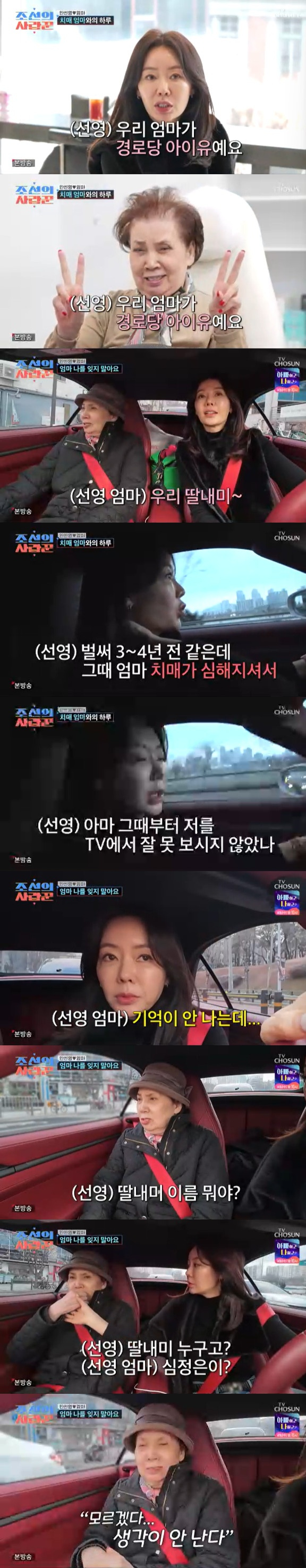 뿐만 아니라 안선영 모친은 "딸내미 이름 뭐야?"라는 물음에 "모르겠다. 생각이 안 난다"라고 말해 눈물샘을 자극했다.