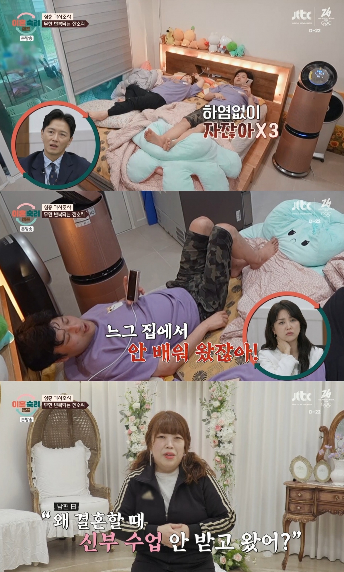 또한 남편은 "대부분이 네가 자서 시간 못 맞추고 아무 얘기도 못 하고 멍때리다가 열받고 여행 가면 시간 놓친다. 모든 게 그거다. 본인 시집올 때 아무것도 안 해서 내가 다 했다. 아무리 귀하게 자라고 뭐해도 '김 서방 아무것도 안 가르쳤다. 시집가면 다 하지 않나' 했다. 엄마가 해준 밥 먹고 살아도 대충은 안다. 너희 집에서 안 배워 오지 않았나"라고 열 냈다. 아내는 "왜 결혼할 때 신부수업 안 받고 왔냐, 자기가 힘들었다고 하는데 요즘 신부 수업받고 가는 사람이 있나"라고 의아해했다.