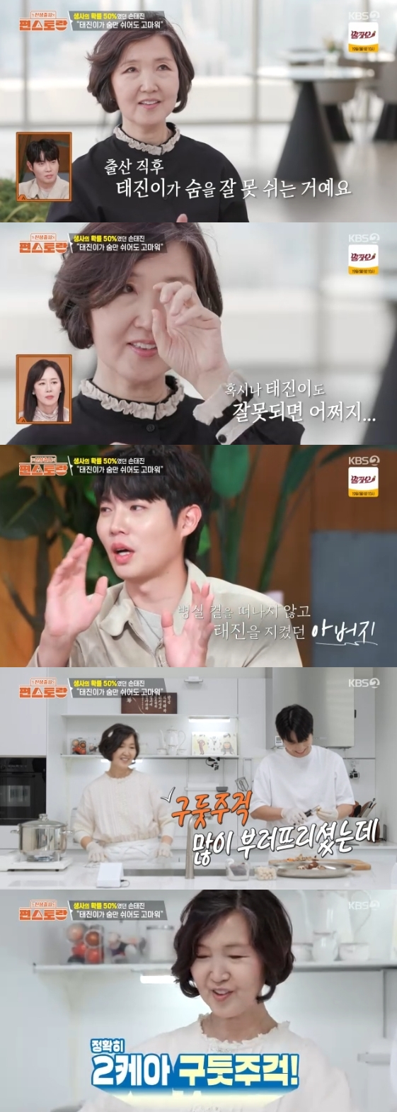 손태진의 어머니는 요리가 서툰 아들에게 "너무 잘한다"라고 폭풍 칭찬을 연발하며 "엄마한테 너무 행복한 시간이다"라고 미소 지었다. 그는 아들과 함께 대화를 나누던 중 "너희 아빠는 태진이가 살아있는 것만으로도 감사하다고 하더라"라고 전해 궁금증을 자아냈다.