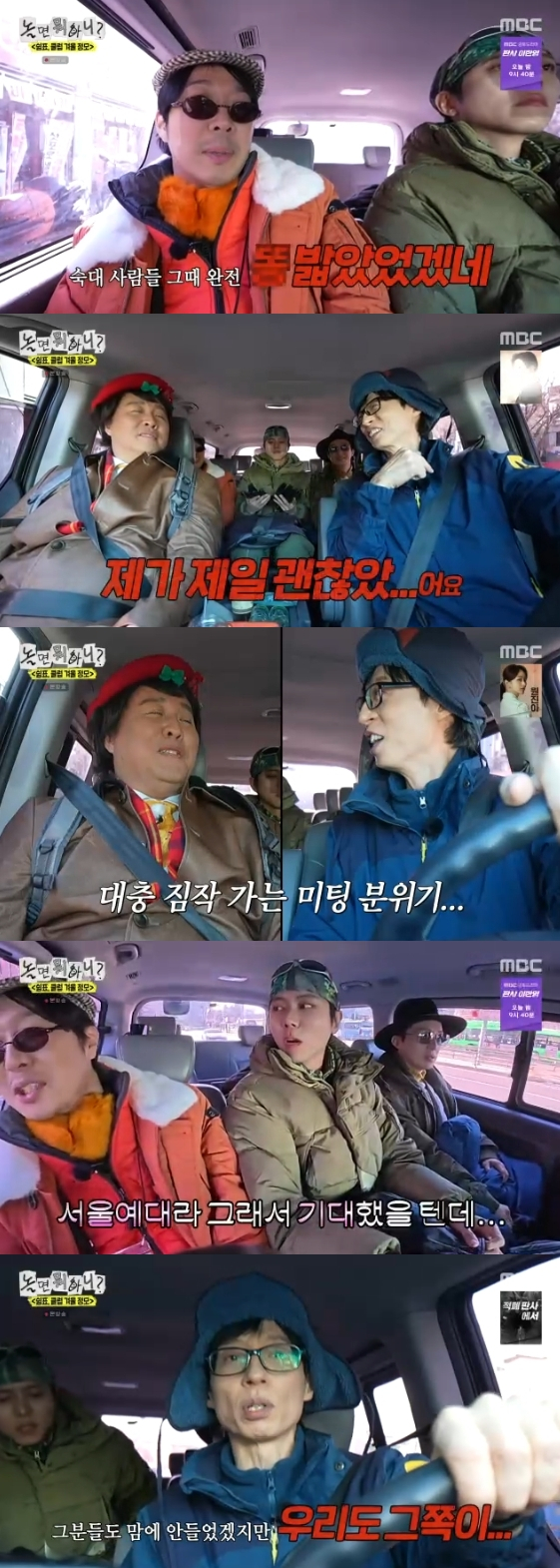 이에 하하는 "숙대 사람들 그때 완전 똥 밟았었겠다"라고 이죽거렸고, 유재석은 "섞박지님, 말조심해서 하라"라고 발끈했다.