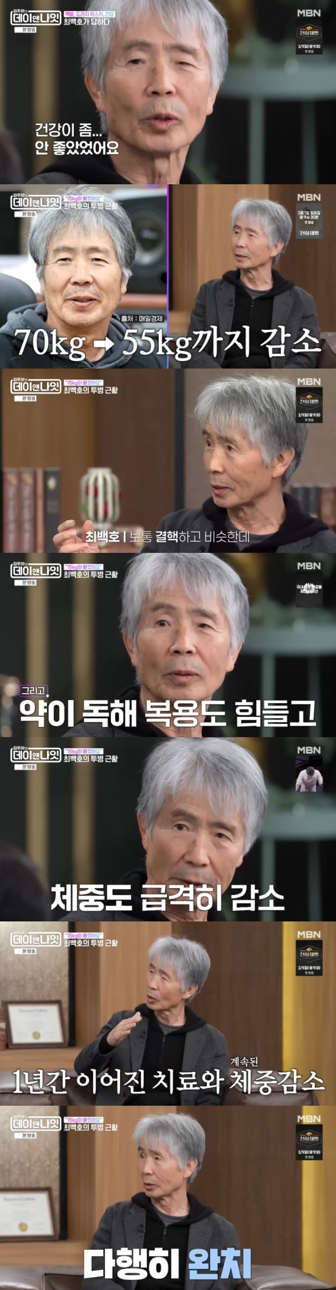 김주하가 최백호의 건강 상태를 묻자 최백호는 "건강이 안 좋았다. 까다로운 질병이 나와서 지금 체중이 15kg 줄었다. 원래 70kg였다가 지금 55kg이 됐다. '비결핵성 항산균증'이 걸렸다. 보통 결핵과 달리 감염이 안 돼서 오히려 약이 개발이 안 됐다"라고 밝혔다.
