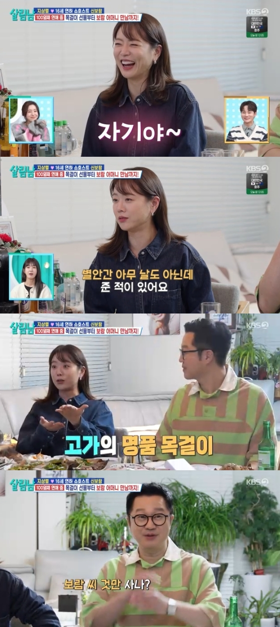 또 신보람은 호칭을 묻는 말에 "자기야"라고 부른다고 답하며 "사귀기 전에 별안간 아무 날도 아닌데 목걸이를 선물로 주더라. 열어 봤더니 에르메스 목걸이였다. 엄마 것까지 사줬다"라고 말해 놀라움을 자아냈다.