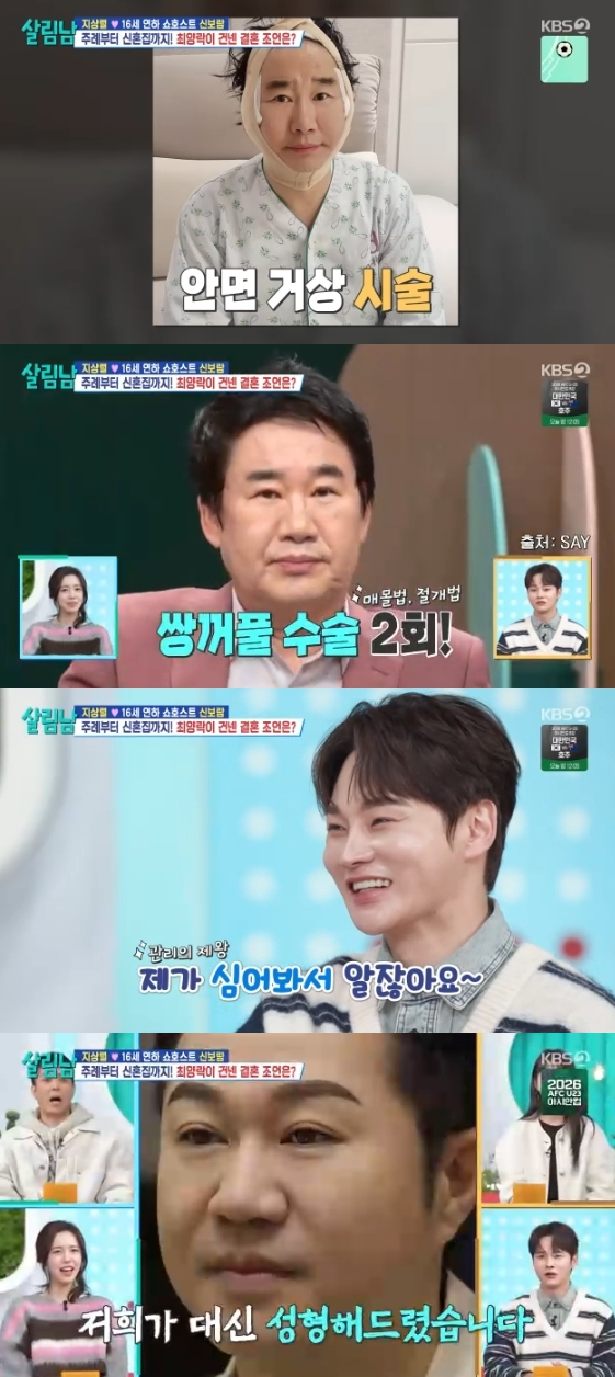 그런가 하면 최양락은 관리 비결을 묻는 말에 "나처럼 개그맨 중에 칼 많이 댄 사람도 없을 거다"라며 성형 수술을 고백해 시선을 모았다. 그는 안면 거상은 물론, 쌍꺼풀 수술 2회, 5028모 모발이식까지 낱낱이 털어놔 모두를 놀라게 했다.