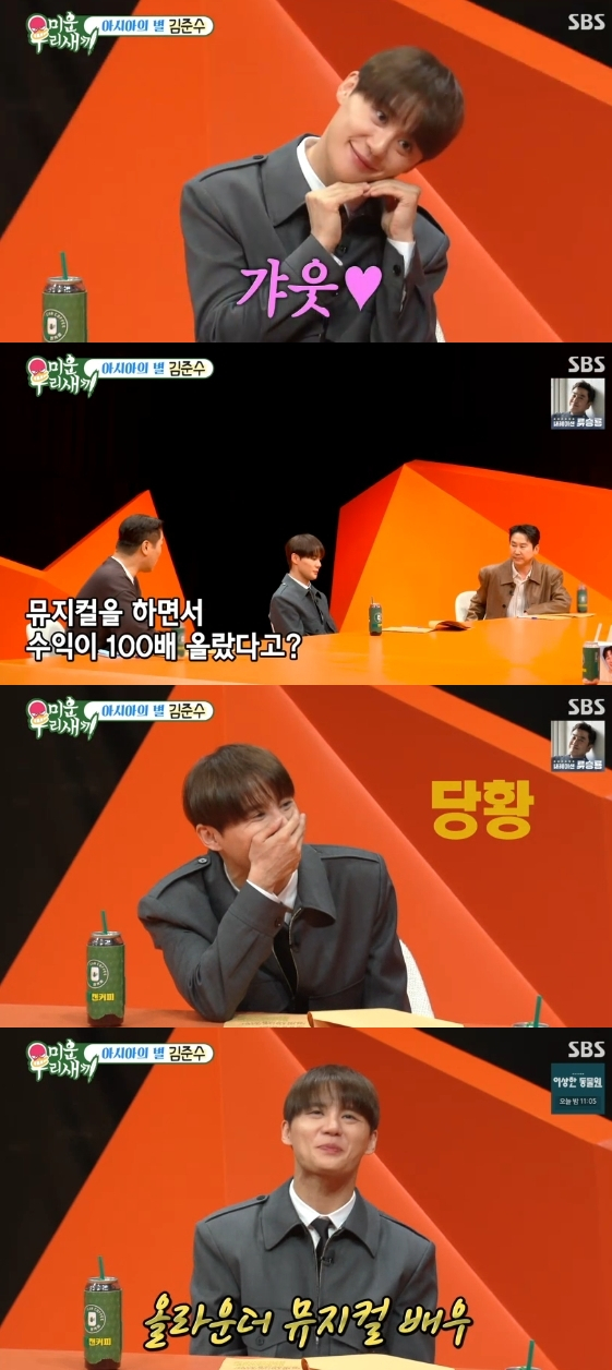 그런가 하면 김준수는 "뮤지컬 하면서 수익이 100배 올랐다는데"라는 질문에 "뮤지컬이라기보다는"이라고 민망한 듯 웃음을 터뜨리며 고수익을 인정하는듯한 제스처를 취했다.