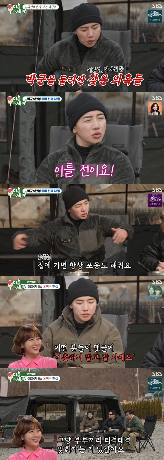 박군의 해명에도 의심을 거두지 못하는 두 사람에게 박군은 한영과 전화 연결을 시도했다. 한영은 "가짜 뉴스를 몰랐다가 어떤 분들이 댓글에 '이혼하지 말고 잘 사세요'라는 댓글을 보고 알았다 저희는 진짜 아무 문제 없다. 부부끼리 티격태격 맞춰가는 것도 없으면 남 아니냐"라고 말했다.