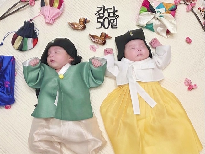 이 가운데 손민수가 강단남매(손강 손단)의 생후 50일을 기념하는 셀프 촬영에 도전해 눈길을 끈다. 특히 생후 59일차 쌍둥이 강단남매의 앙증맞고 사랑스러운 한복 비주얼이 공개돼 감탄을 불러일으킨다.