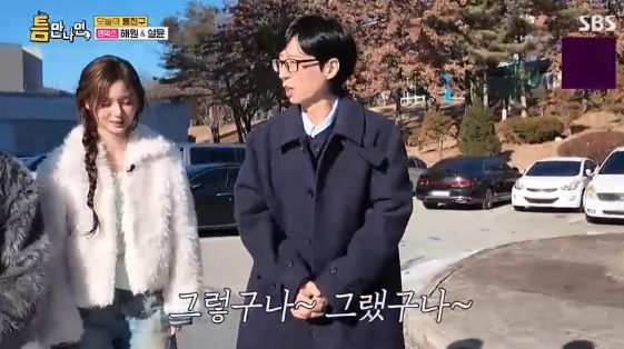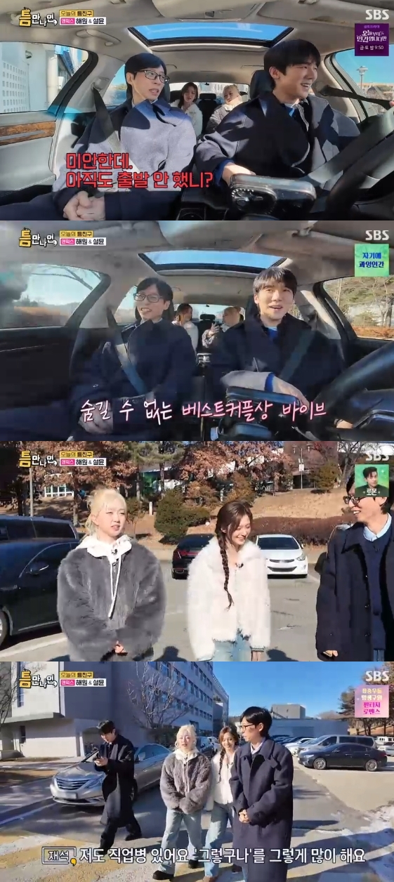 이날 '틈 장소'인 카이스트로 향하는 차 안에서 뒷좌석에 앉은 해원은 운전대를 잡고 옥신각신하는 유재석, 유연석을 보고 "대화하시는 게 장기연애 하는 커플 같다. 투닥투닥하신다"라고 말해 웃음을 자아냈다. 해원은 JYP 예능돌 계보를 잇는 차세대 주자답게 '2025 SBS 연애대상'에서 베스트커플상을 수상한 두 사람의 케미를 한마디로 정리하며 남다른 예능 센스를 선보였다.