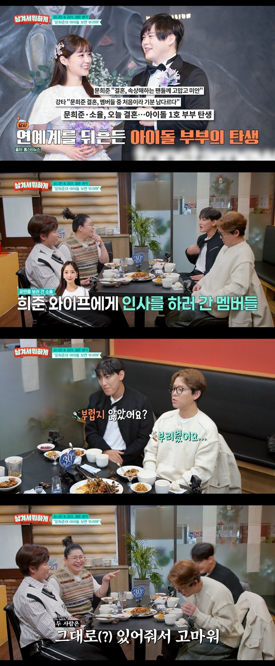 이후 강타와 토니안은 문희준과 전화 연결을 했다. 문희준은 두 사람의 결혼에 대해 "둘 다 결혼 생각이 있다고 들었다"며 "만약 여자친구가 있고 결혼할 마음이 있다면, 아이를 먼저 낳는 걸 추천한다"라고 말해 웃음을 자아냈다.