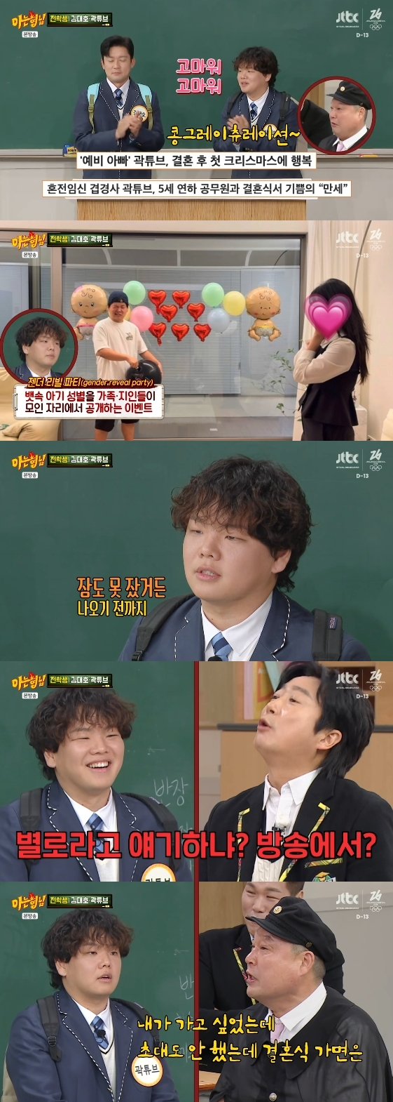 그런가 하면 곽튜브는 같은 소속사 동료인 강호동, 서장훈이 결혼식에 참석하지 않아 섭섭했다고 밝혀 시선을 모았다. 강호동은 "나는 포털 사이트에서 결혼 소식을 알았다"라고 항변했고, 이수근은 "(입사 후에)강호동에게 인사 안 온 건 네가 처음이다"라고 농담을 던져 웃음을 안겼다.