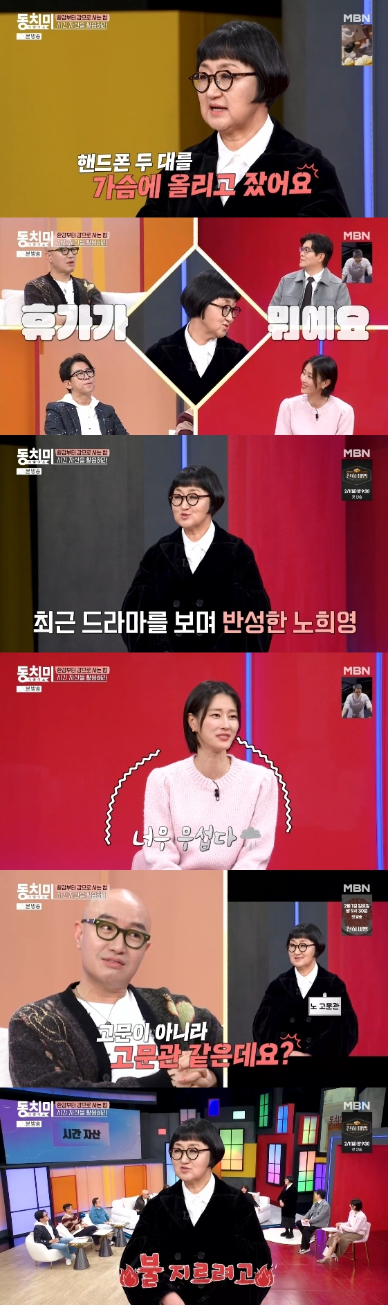이날 노희영은 24시간 업무 태세를 갖추고 살았던 과거를 떠올렸다. 그는 "옛날에 회사 다닐 때 휴대전화 두 대를 가슴에 얹고 잤다. 보스한테 전화 올까 봐. 누워서 받은 적도 없고 자다가도 안 잔 것처럼 받았다"라고 밝혀 놀라움을 자아냈다.