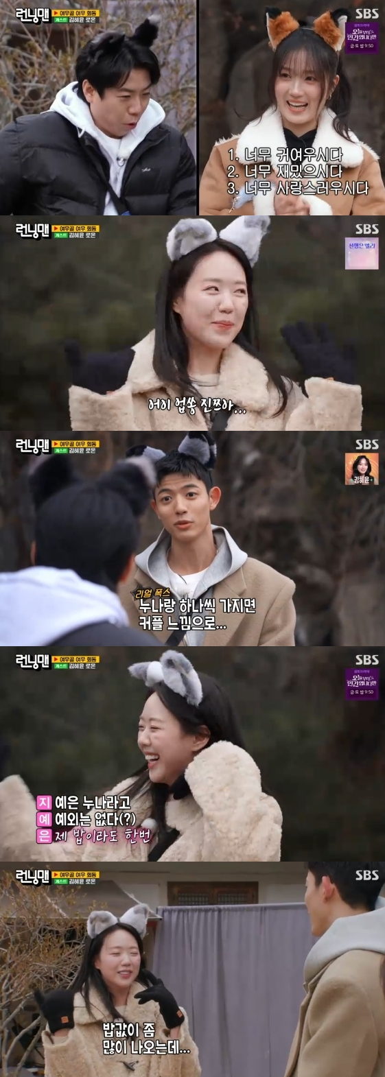 이날 멤버들은 구미호가 되고 싶은 여우로 변신해 아홉개의 꼬리를 완성하는 미션을 진행했다. 김혜윤은 특유의 사랑스러운 미소와 폭풍 애교로 김종국과 양세찬의 꼬리를 하나씩 획득했다.