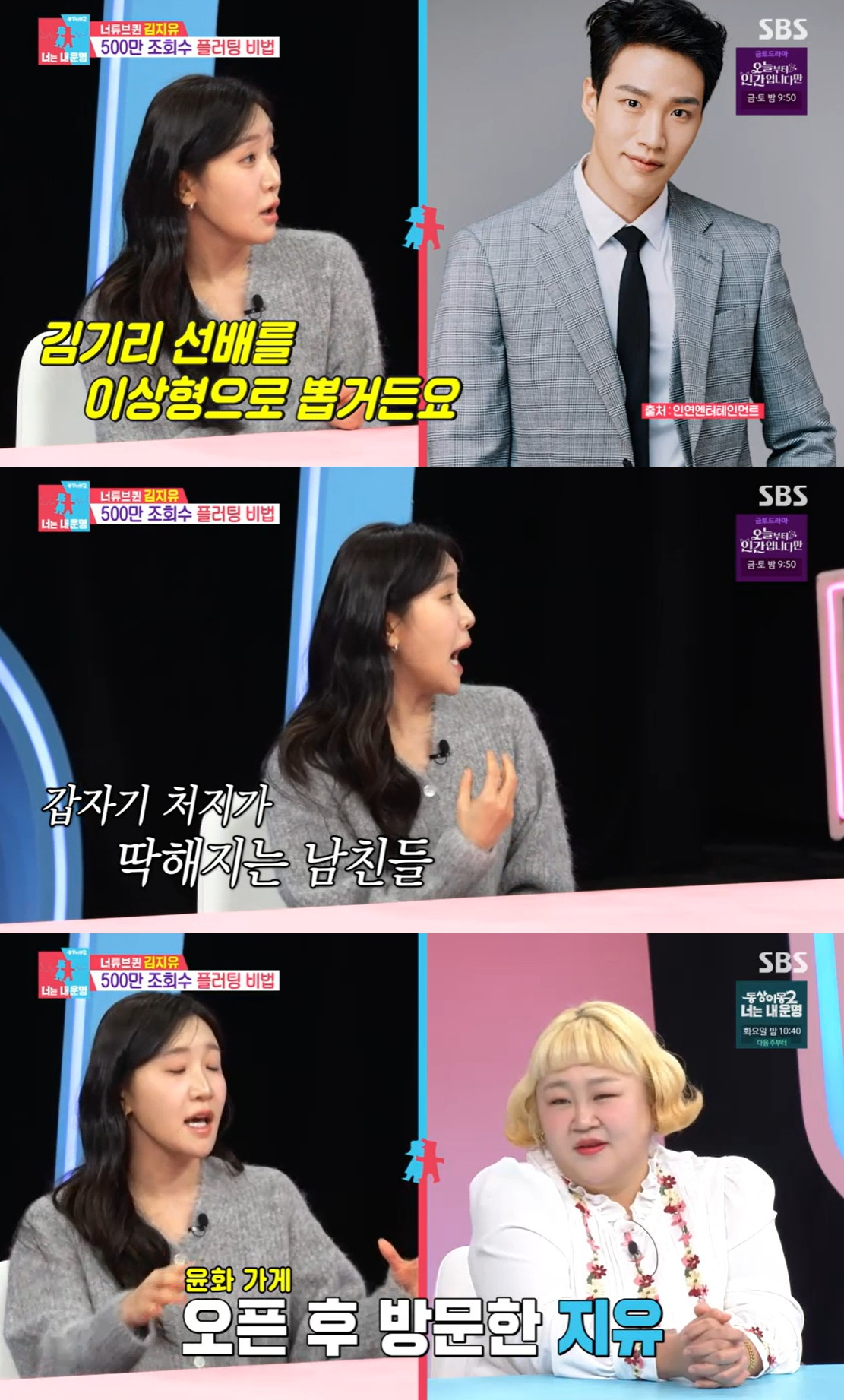 김지유는 "내가 여태 연애사를 돌아보면 김기리를 이상형으로 뽑는다. 훈훈한 스타일에 연하남을 좋아한다"라고 말했다.