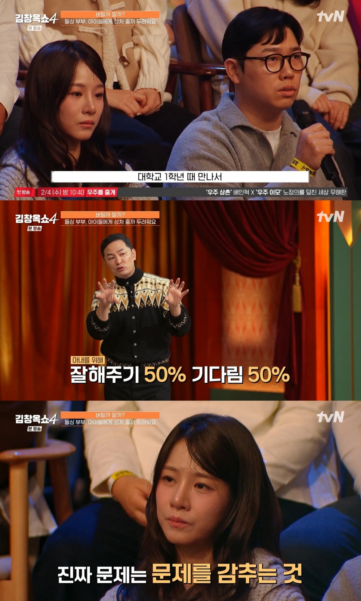 김창옥은 "해병대 정신으로 하는 거 좋다. 사랑의 다른 이름은 잘해줌이 아니다. 기다림, 상대를 인정하는 거다. 그게 사랑의 본질과 더 가깝다. 그렇지 않나. 상대방이 원하는 방식으로 주는 게 사랑이다. 나의 결핍으로 주는 게 사랑은 아니다"라고 단언했다.