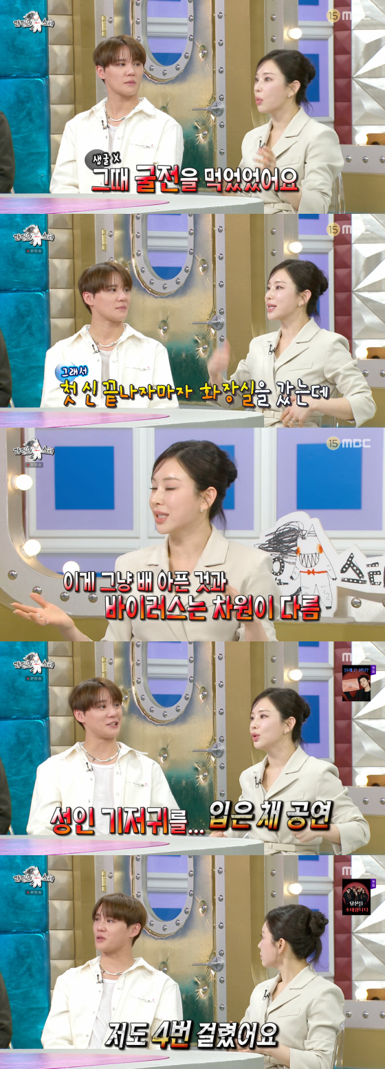 그는 "그냥 배가 아픈 것과 바이러스는 차원이 다르다. 내 몸의 모든 구멍이 다 열린 것 같았다. 토도 엄청 했다. 우리는 노래할 때 배를 쓰니까 어쩔 수가 없지 않나. 그래서 성인 기저귀를 차고 무대에 올랐다"고 고백했다.