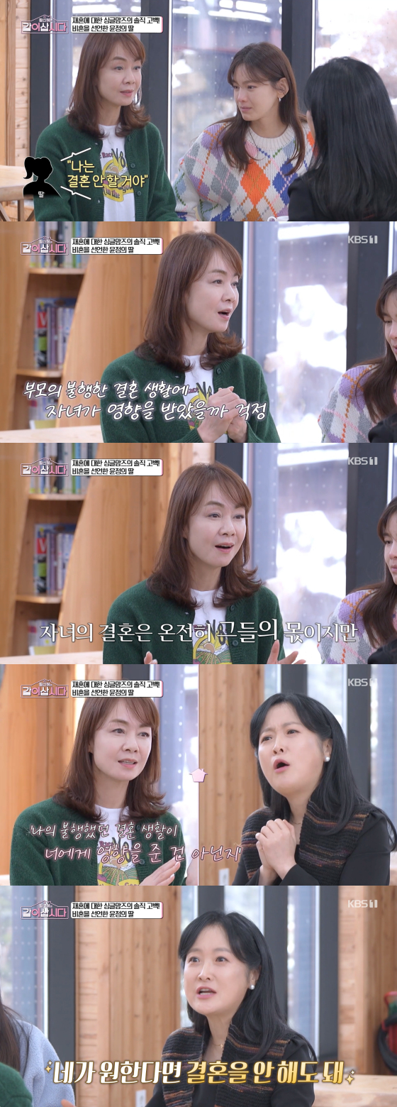 28일 방송된 KBS 1TV 예능 프로그램 '황신혜의 같이 삽시다'에서는 싱글맘 황신혜, 정가은, 장윤정이 심리 상담가 박상미를 만나는 모습이 그려졌다.