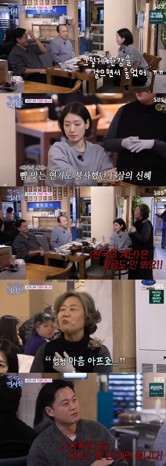 이를 듣던 김광규는 박신혜의 어머니에게 "아역하면서 뺨 맞고 할 때 어떠셨냐"라고 물었고, 박신혜 어머니는 "대본 봤을 때 뺨 맞는 신 있다고 하면 가짜로 맞는 줄 알았는데 진짜 맞는 걸 본 뒤로는 '천국의 계단'은 지금도 안 본다"라고 말했다.