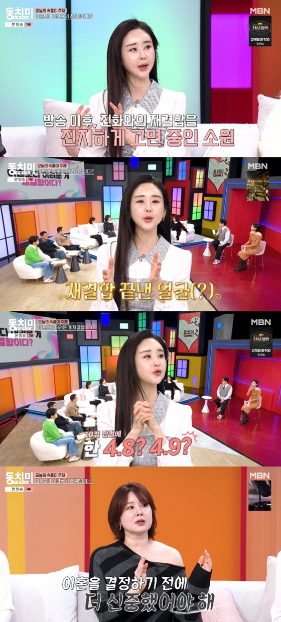 그러자 배우 김지연은 "깨진 접시는 다시 붙이면 안 된다고 생각한다. 이혼 결심을 했다면 결심한 순간까지 고민을 많이 했을 텐데, 그게 신중했어야 했다고 생각한다. 그 답이 이혼이었기 때문에 이후 재결합은 없어야 한다고 생각한다"고 했다.