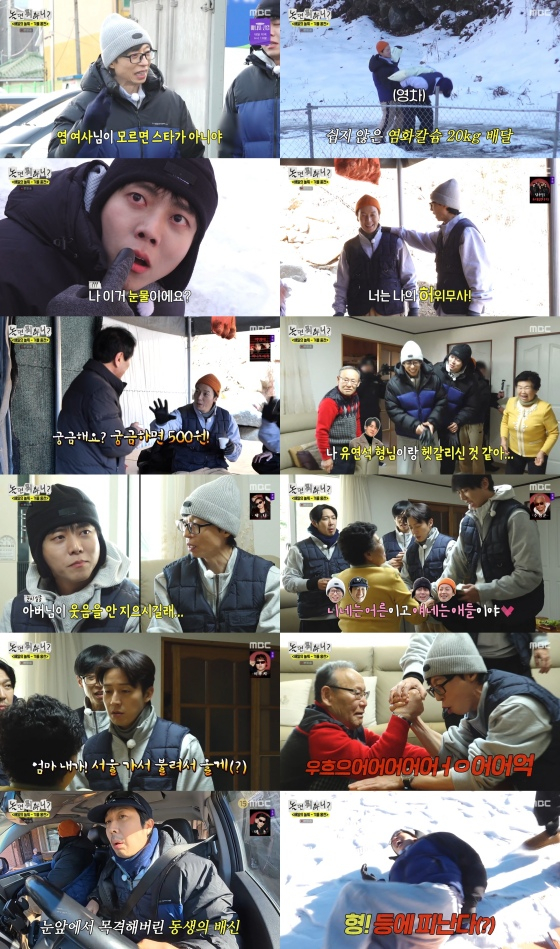 영하 17도 강추위 속 네 사람은 읍내로 나오기 힘든 주민들을 위해 필요 물품과 염화칼슘 배달을 시작했다. 첫 배달부터 위기였다. 도로가 얼어 20kg 무거운 염화칼슘을 직접 짊어지고 오르막길을 가야 했던 것. 혼자 뒤처진 주우재는 바닥에 퍼질러진 채 "힘든 사람 처음 봐요?"라고 말하며 눈물을 흘려 웃음을 자아냈다. 허경환은 대벌레처럼 쓰러진 주우재를 지나쳐 유재석을 따라갔고, 유재석은 "경환이는 나의 '허위무사'다. 빌 허(虛)"라고 임명했다.