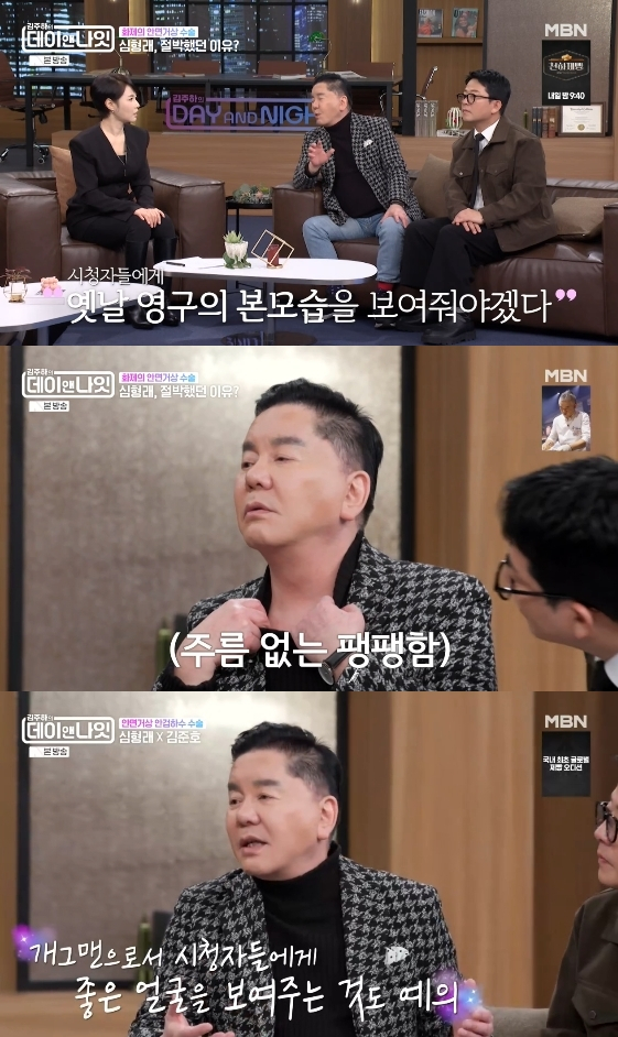 그는 "제가 유튜브를 하는데 거기서 영구로 나온다. 아무리 분장해도 영구 얼굴이 안 나오더라. 영구는 팽팽한 얼굴이 특징인데 분장해도 안되길래 시청자들에게 예전 영구의 모습을 보여줘야겠다고 고민하던 차에 거상 수술을 했다. 목주름까지 다 없어졌다"라고 자랑했다.
