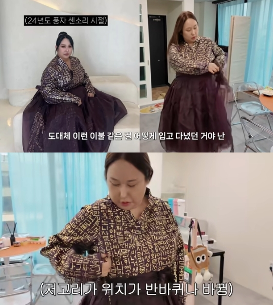 풍자는 저고리 위치가 반바퀴나 바뀌었다고 가리키며 "사이즈가 너무 커져서 오늘 옷이 벗겨질 수 있지만 안에 옷을 입었으니 걱정하지 말라"라고 너스레를 떨었다.