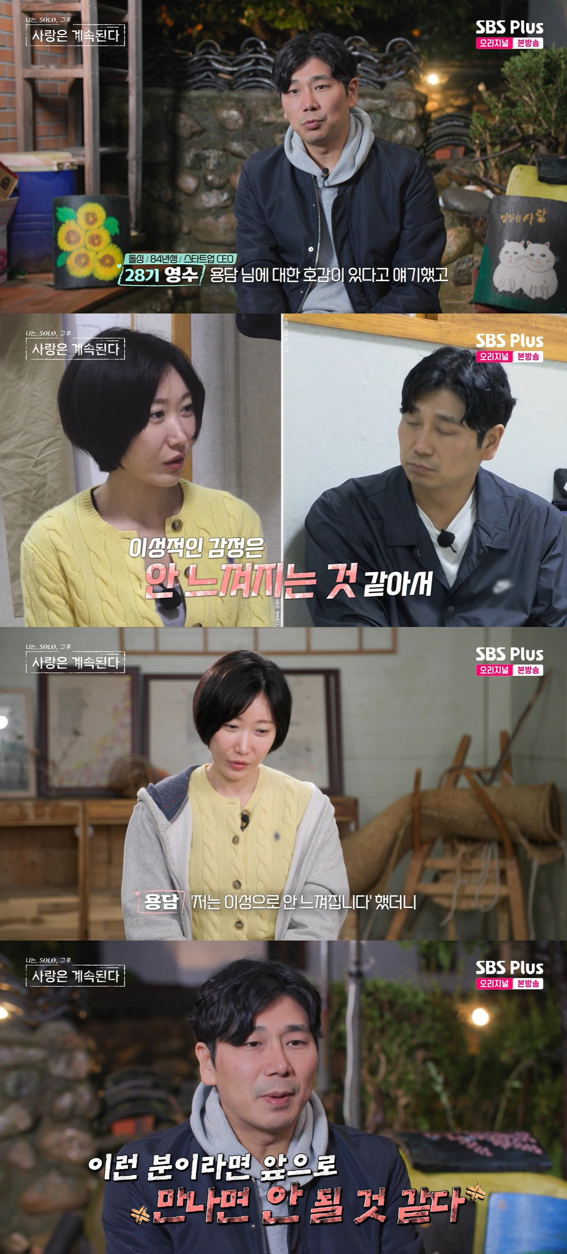 이에 28기 영수는 "이건 용담한테 들어야 하는데 왜 미스터 킴이, 그것도 흐뭇해하면서 얘기하나. 난 분명 용담에 호감이 있다고 말했는데 이해는 안 됐다, 그 상황 자체가"라고 분노했다.