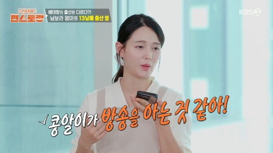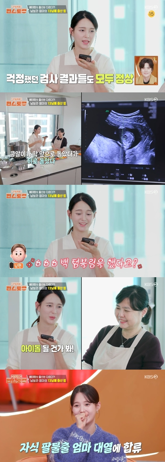 이어 "콩알이가 방송을 아는 것 같다. 초음파 검사하는데 앞으로 돌았다가 뒤로 돌았다가 뱃속에서 백 텀블링을 하더라"라고 들든 표정을 지었다.