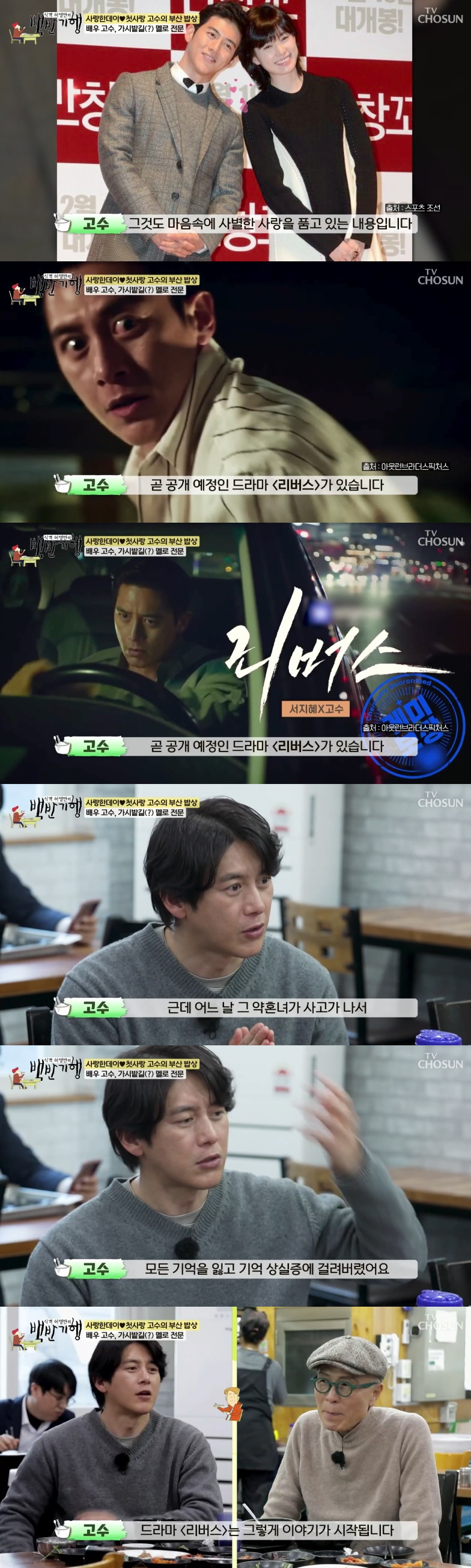 고수는 "제가 이번에 드라마 '리버스'란 작품을 했다. 약혼을 했는데 약혼녀가 사고를 당해서 모든 기억을 잃고 기억 상실증에 걸린 거다. 그렇게 얘기가 시작된다. 미스터리 멜로 복수극이다"라고 밝혔다.
