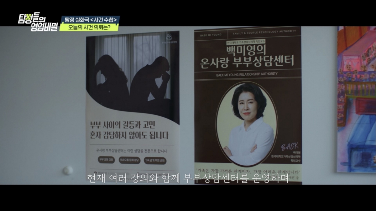 '탐정들의 영업비밀'에서 유명 부부 상담가 아들의 반복된 외도 행각이 드러난다.