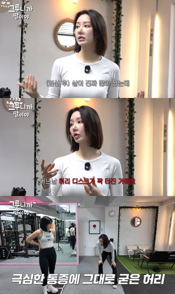 그는 "임신 후에 살이 진짜 많이 쪘는데 그 상태에서 근육도 다 빠지니까 어느 날 허리 디스크가 터졌다. 허리를 굽힌 상태에서 움직이질 못했다. 굽히지도 못하고 펴지도 못하는 상태로 라온이, 다온이 등원시키고 병원 치료받는 걸 몇 년간 하다가 근육을 만들면 좀 낫다고 해서 운동을 시작했다"라고 설명했다.