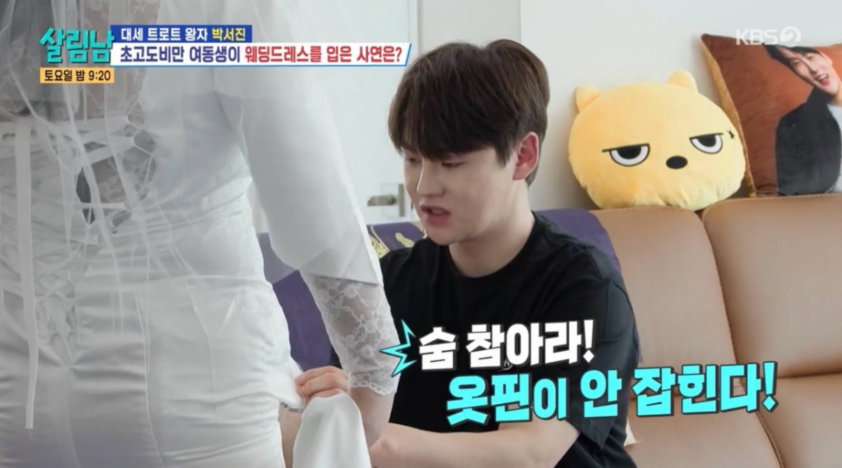 이날 방송은 재봉틀 소리로 시작됐다. 박서진은 과거 무대 의상이 비싸 직접 의상을 만들며 익힌 실력을 발휘해 웨딩드레스 수선에 나섰다. 갑작스러운 그의 행동에 동생 효정은 "오빠 결혼하나?"라며 놀랐지만, 박서진의 의외의 답이 돌아왔다. 예쁜 드레스를 보면 동생이 살을 빼고 싶은 욕구가 생길 것 같다는 생각에 동생 맞춤형으로 직접 준비했던 것.