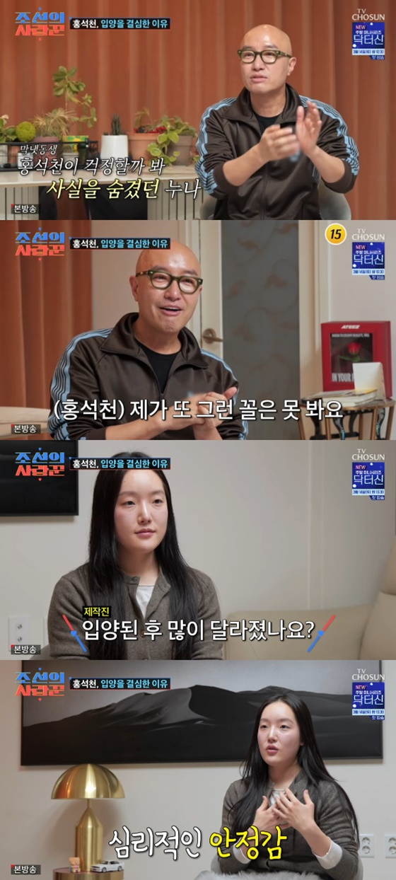 홍석천 딸은 입양 후 변화를 묻는 질문에 "내 삶이 그날로부터 엄청나게 달라졌다. 심리적인 안정감이 있다. 혹시라도 내가 갑자기 도움이 필요할 때 요청하면 뭐든 들어줄 거 같은 안도감이 있었다. 후회는 절대 안 한다"고 답했다.