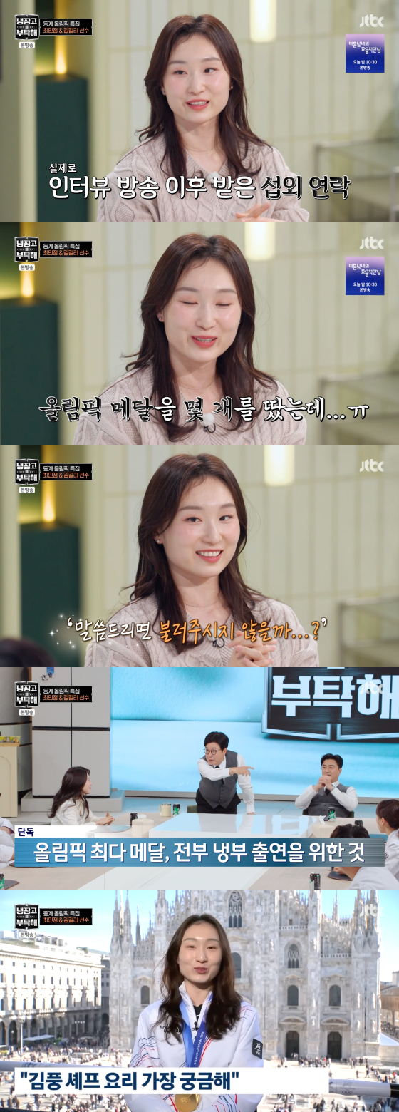 15일 오후 방송된 JTBC 예능 프로그램 '냉장고를 부탁해'에는 2026 밀라노-코르티나 동계올림픽 쇼트트랙 국가대표 최민정, 김길리가 게스트로 출연했다.