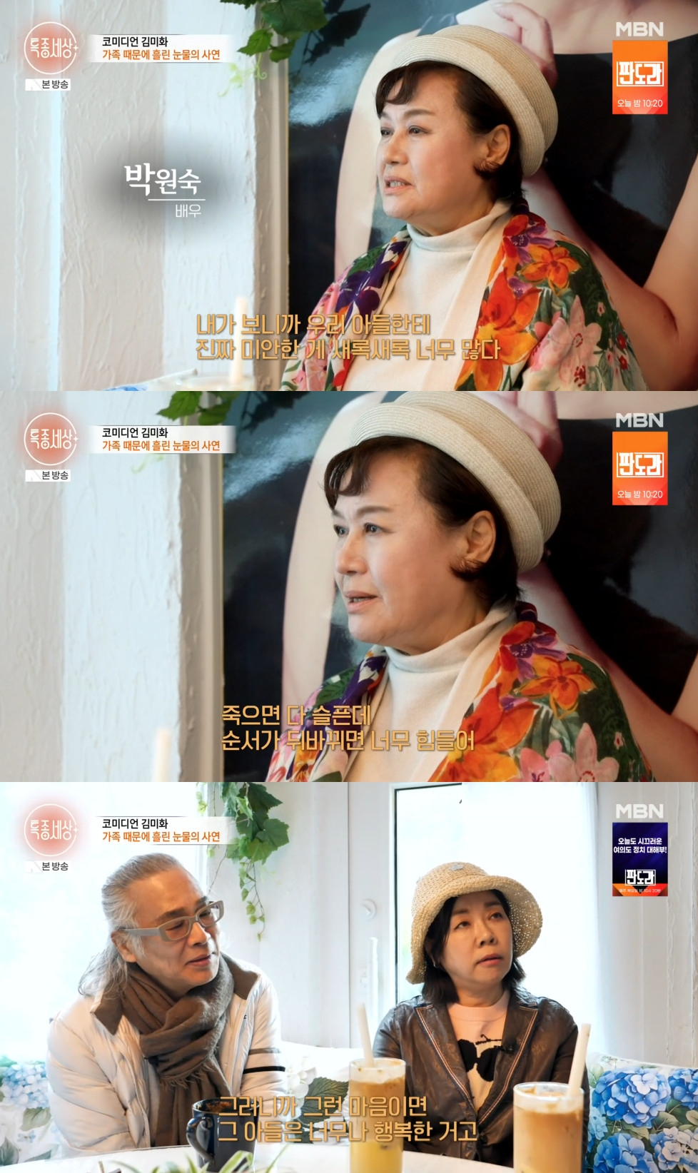 박원숙은 20년 전 교통사고 세상을 떠난 아들을 회상하며 "내가 아침에 우리 매니저랑 얘기했는데 우리 아들한테 진짜 미안한 게 너무 많다고 했다. 어린 시절 너무 힘들고 외롭고 쓸쓸하게 살았다는 게 떠올라서 우리 아들한테 미안하다고 했다. 너한테 훌륭한 엄마 얘기를 들으니까 더 부끄럽다"며 "죽으면 다 슬픈데 순서가 뒤바뀌면 너무 힘들다"고 말했다.