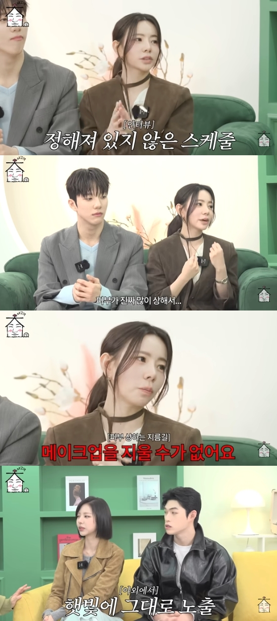 홍지연은 "저희가 새벽 3~4시에 자고 아침 7시에 일어났다. 촬영 끝나고 오니까 피부가 진짜 많이 상했다. 인터뷰를 새벽까지 하니까 메이크업을 지울 수가 없다"라고 토로했다.