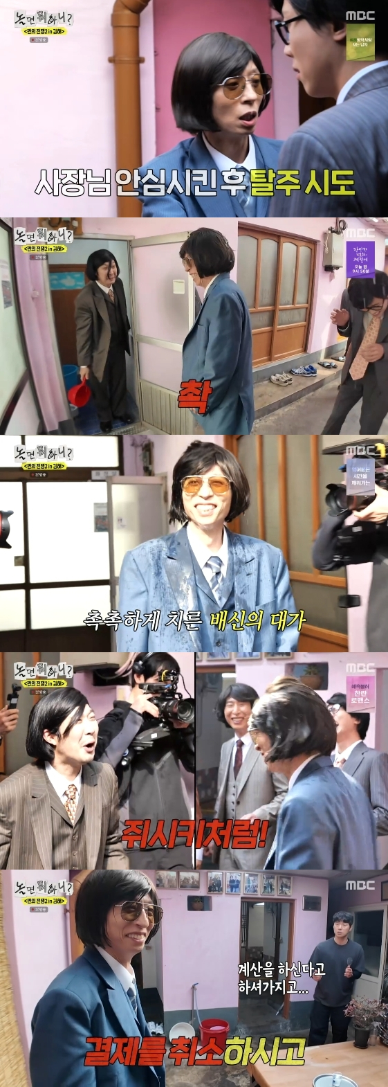 유재석이 "하하가 낼 겁니다"라고 말한 뒤 조심스럽게 식당을 빠져나가려던 찰나, 이를 눈치챈 하하는 유재석에게 물벼락을 퍼부었다.