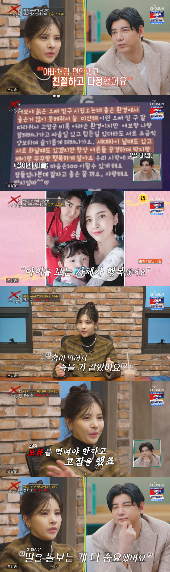 박재현은 다툼을 할 때면 나이 차이를 언급하기도 했다고. 한혜주는 "박재현의 이혼 사유는 제가 시어머니를 모시지 않았기 때문이다. 그런데 저는 (시어머니보다) 심장병을 가지고 태어난 딸이 더 중요했다"고 밝혔다.