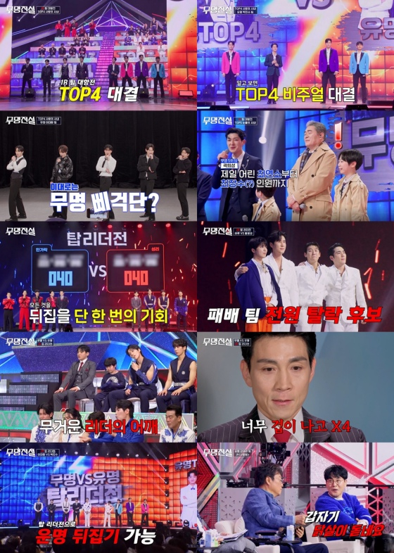 25일 방송되는 MBN '무명전설' 5회에서는 지난 4회에 이어 본선 1차 '팀 데스매치' 1라운드 '팀 대항전'이 이어지는 가운데, 남은 4, 5위 팀의 승부와 결과가 공개된다. 승리 팀에 가산점이 반영된 상태에서 진행되는 2라운드 '탑 리더전'에서는 리더들의 한 곡 대결로 팀 전체의 희비를 가르는 결정적 승부가 펼쳐진다.