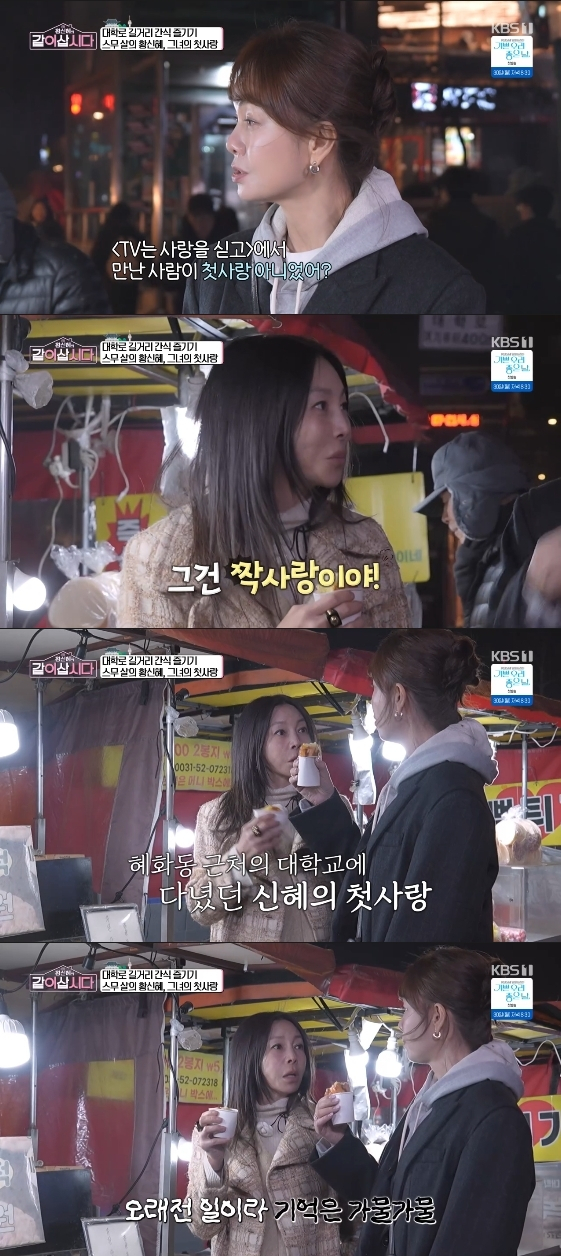 황신혜는 "'TV는 사랑을 싣고'에서 첫사랑 만났던 거 아니었냐"는 장윤정의 질문에 "그건 초등학교 3학년 때 짝사랑이다. 첫사랑이 이 근처 성균관대에 다녔다. 그래서 그 학교 앞에 갔던 추억이 있다"라고 회상했다.