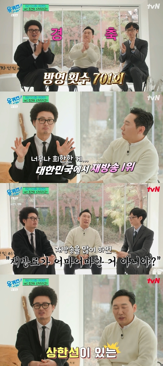 윤택은 "너무나 희한한 게 대한민국에서 재방송을 제일 많이 하는 프로그램이 됐다"라고 입을 열었고, 유재석은 "지금도 틀면 어디서 나온다. 재방료에 대해 궁금해하시는 분들도 많더라"라고 질문했다.