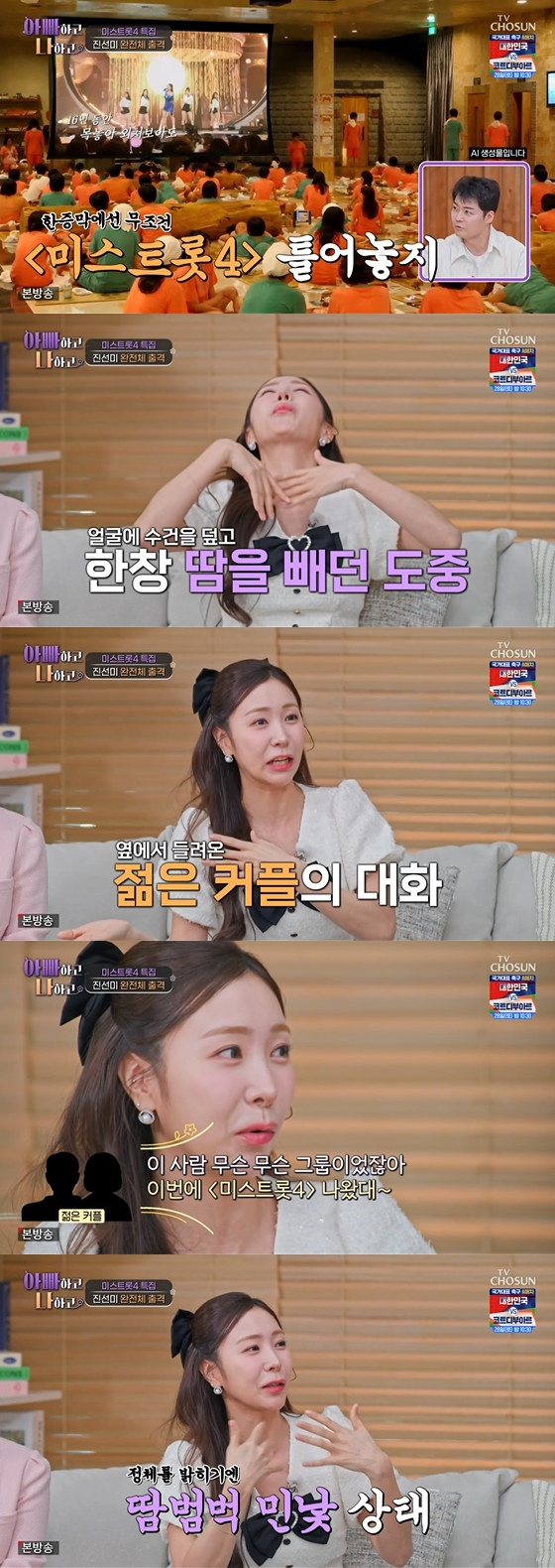 이날 허찬미는 "인기를 실감하느냐"라는 물음에 "'미스트롯4' 경연 중에 불한증막에 잠깐 간 적이 있다. 이렇게까지 많은 분이 알아보실 거라 생각을 못 하고 간 거다. 수건을 덮고 누워 있는데, 옆에 젊은 커플이 제 영상을 보며 얘기를 나누더라. '무슨 무슨 그룹이었잖아, 이번에 미스트로4 나온데' 그러셨다"라는 일화를 꺼냈다.